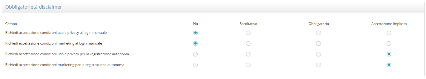 Il campo Obbligatorietà disclaimer permette di rendere obbligatoria, facoltativa, implicita o superflua l’accettazione delle condizioni d’uso da parte degli utenti che creano un account. Per rendere operative le impostazioni desiderate è sufficiente selezionare dal menù a scelta multipla i settaggi che si ritengono necessari.